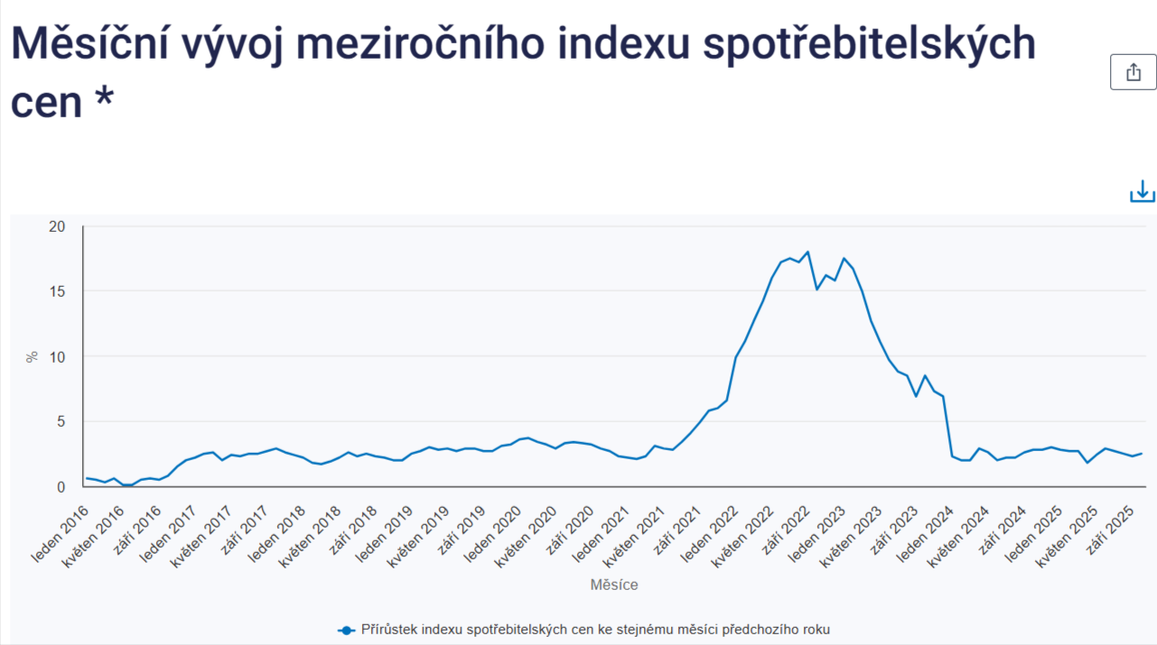 Zveřejněná data za říjen potvrzují, že inflace v Česku zůstává pod kontrolou. Meziročně se ceny zvýšily o 2,5 % (v září to bylo 2,3 %) a měsíčně o 0,5 %. To znamená, že se stále držíme uvnitř tolerančního pásma České národní banky (1–3 %). V harmonizovaném vyjádření HICP je říjnová inflace 2,3 %, tedy lehce nad odhadem pro eurozónu (2,1 %).