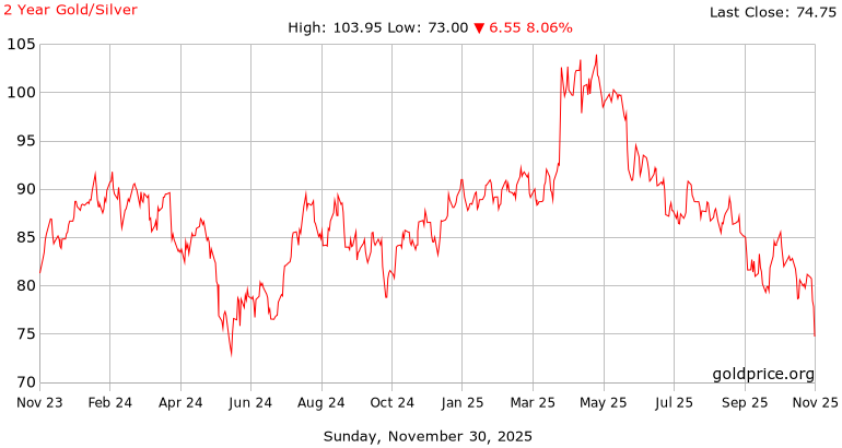 Výsledkem je snížení hodnoty poměru ceny zlata a stříbra pod 75, což je minimu za posledních 18 měsíc – viz dvouletý graf.