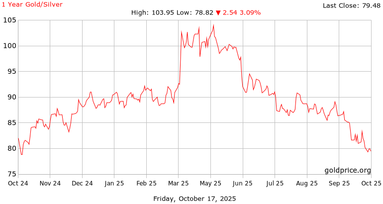 V druhé polovině období se trend zrychlil směrem dolů. Poměr klesl pod 84 bodů na začátku října a pokračoval v sestupu, s minimem 79,33 bodu. K 17. říjnu 2025 uzavřel na hodnotě 79,48, což představuje celkový pokles o 8,20 bodu neboli 9,35 % oproti maximu