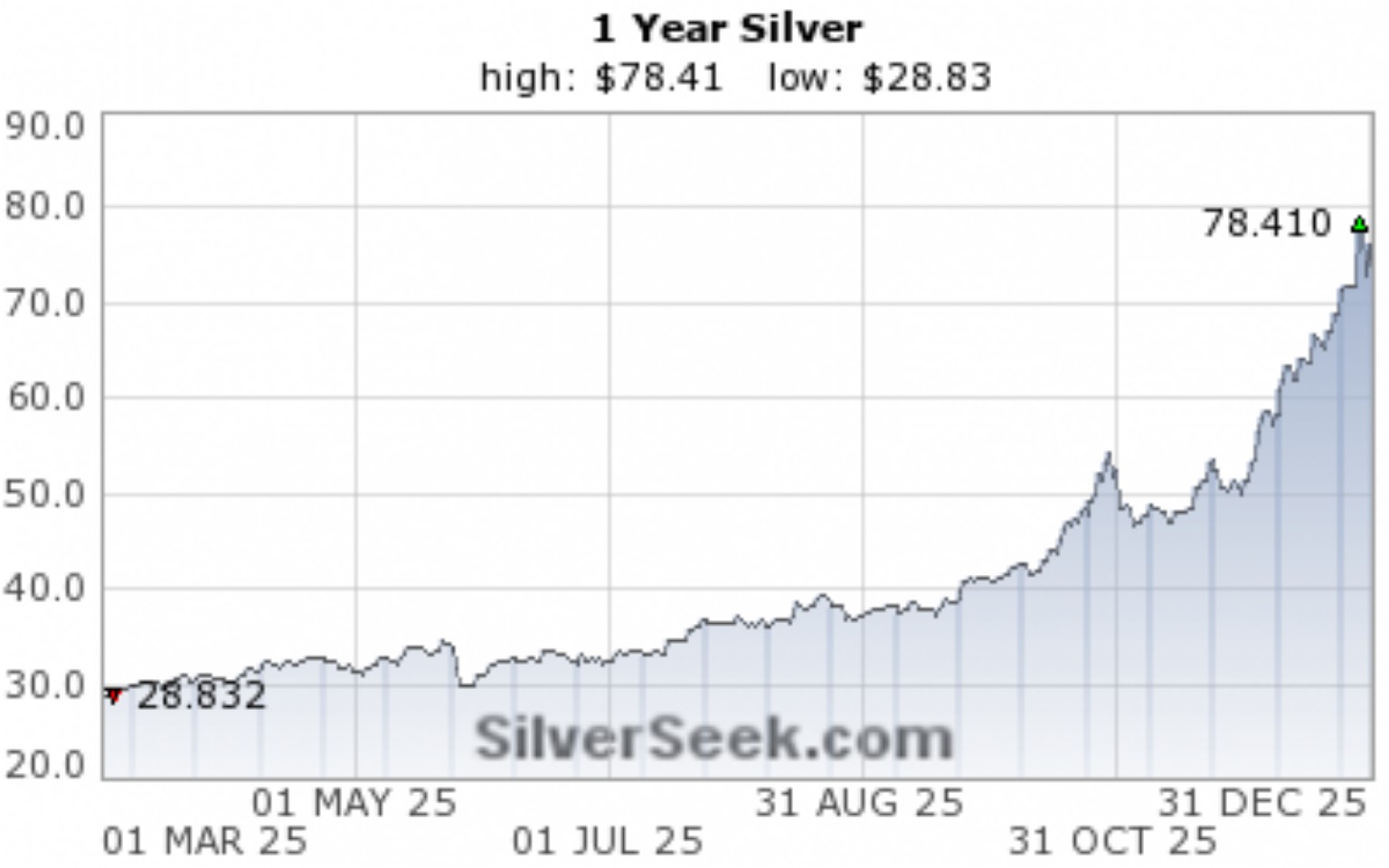 Listopad a prosinec přinesly explozivní růst: ceny vystřelily k historickým vrcholům, krátce překročily 80 USD/oz. Maximum bylo dosaženo 29. prosince na 83,64 USD/oz, rok stříbro zakončilo kolem 72 USD/oz, což představuje nárůst o 144 % od začátku roku. Vývoj ceny je patrný z následujícího grafu: