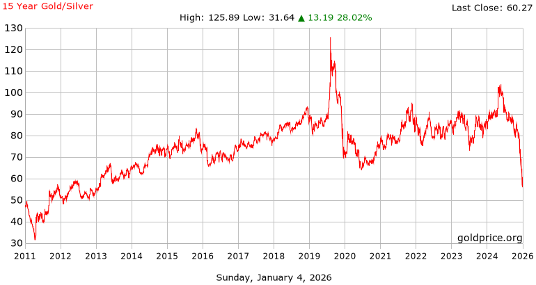 Nejpřesnější analytickou zkratku roku 2025 nabízí poměr zlato/stříbro. Na začátku roku se pohyboval výrazně nad dlouhodobým průměrem, což implikovalo relativní slabost stříbra. Ve druhé polovině roku však docházelo k výraznému poklesu. V posledním prosincovém týdnu se dostal na 56 a rok 2025 ukončil na úrovni 60, což je dvanáctileté minimum. Zde je patnáctiletý graf:
